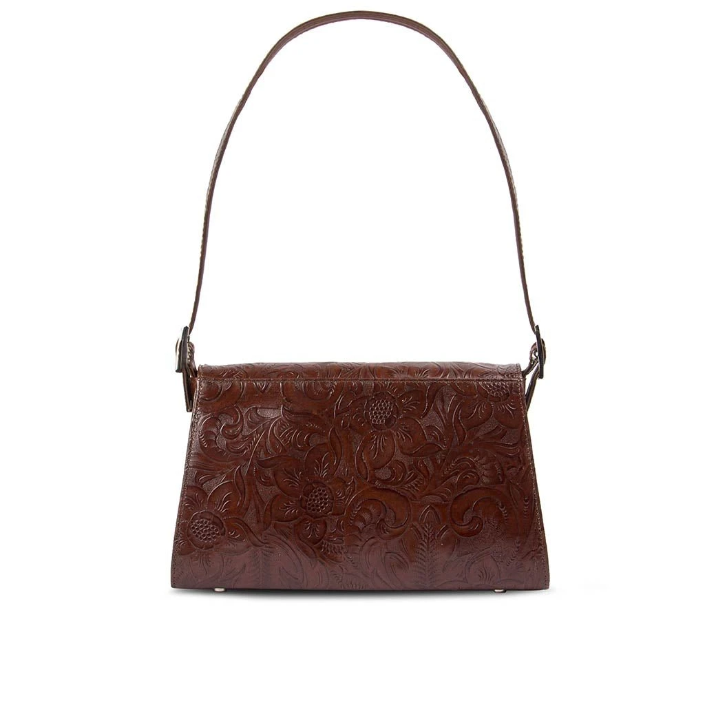 Bolso de color marrón con bordados de flores a lo largo de todo el bolso.