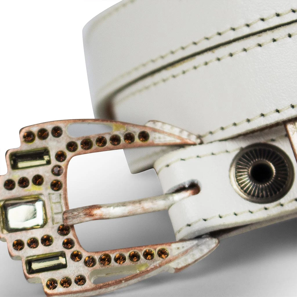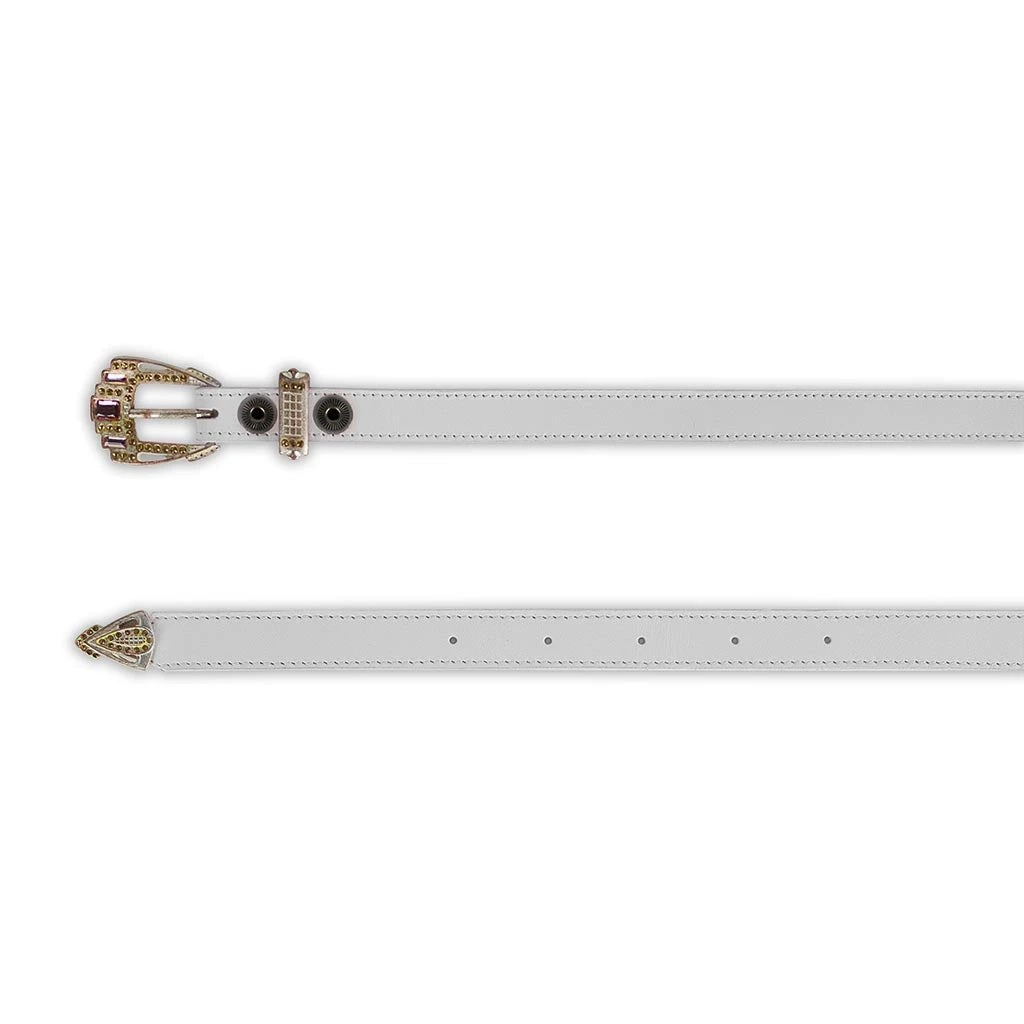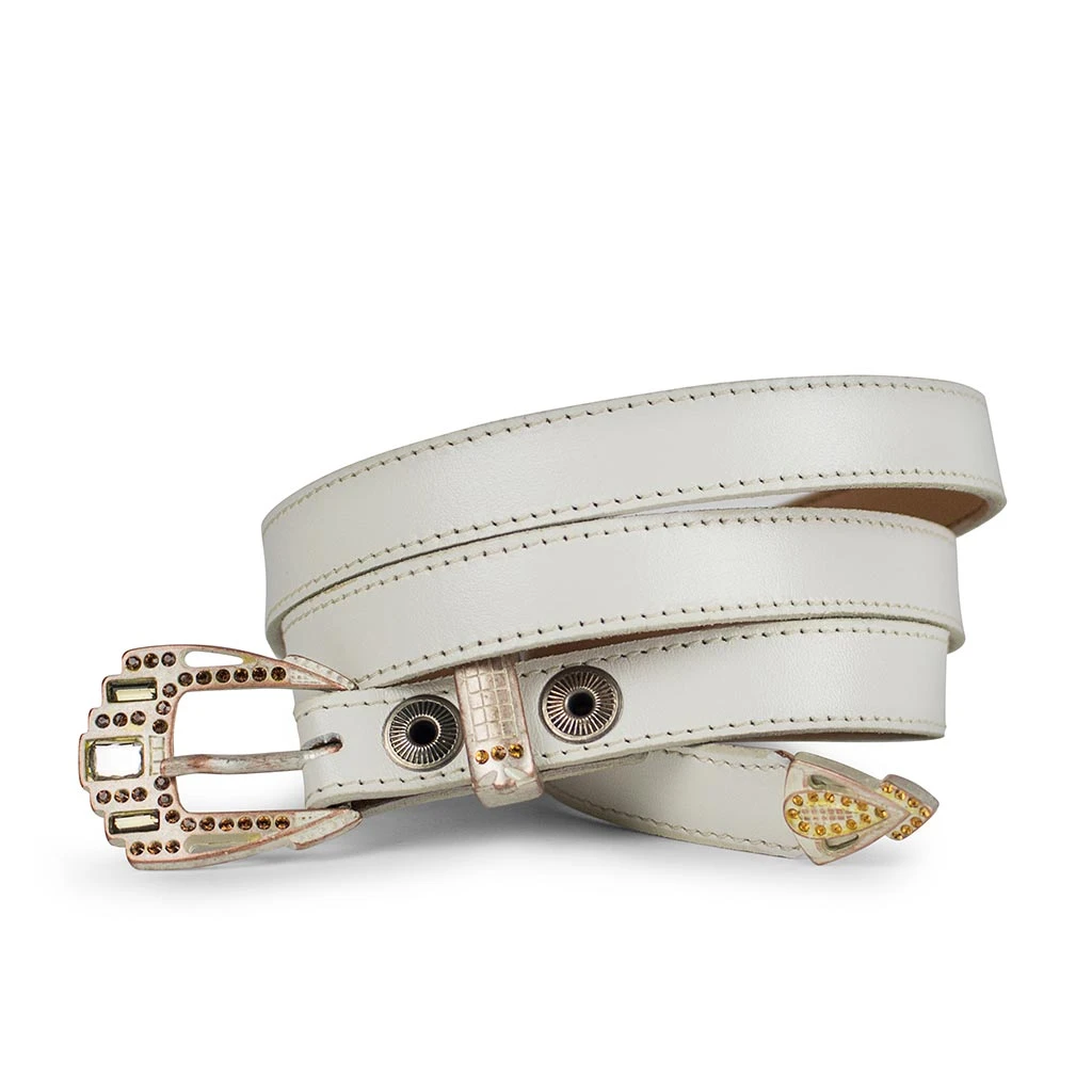 Cinturón blanco de piel con hebilla especial de strass, fino en su grosor con un estilo clásico y femenino.