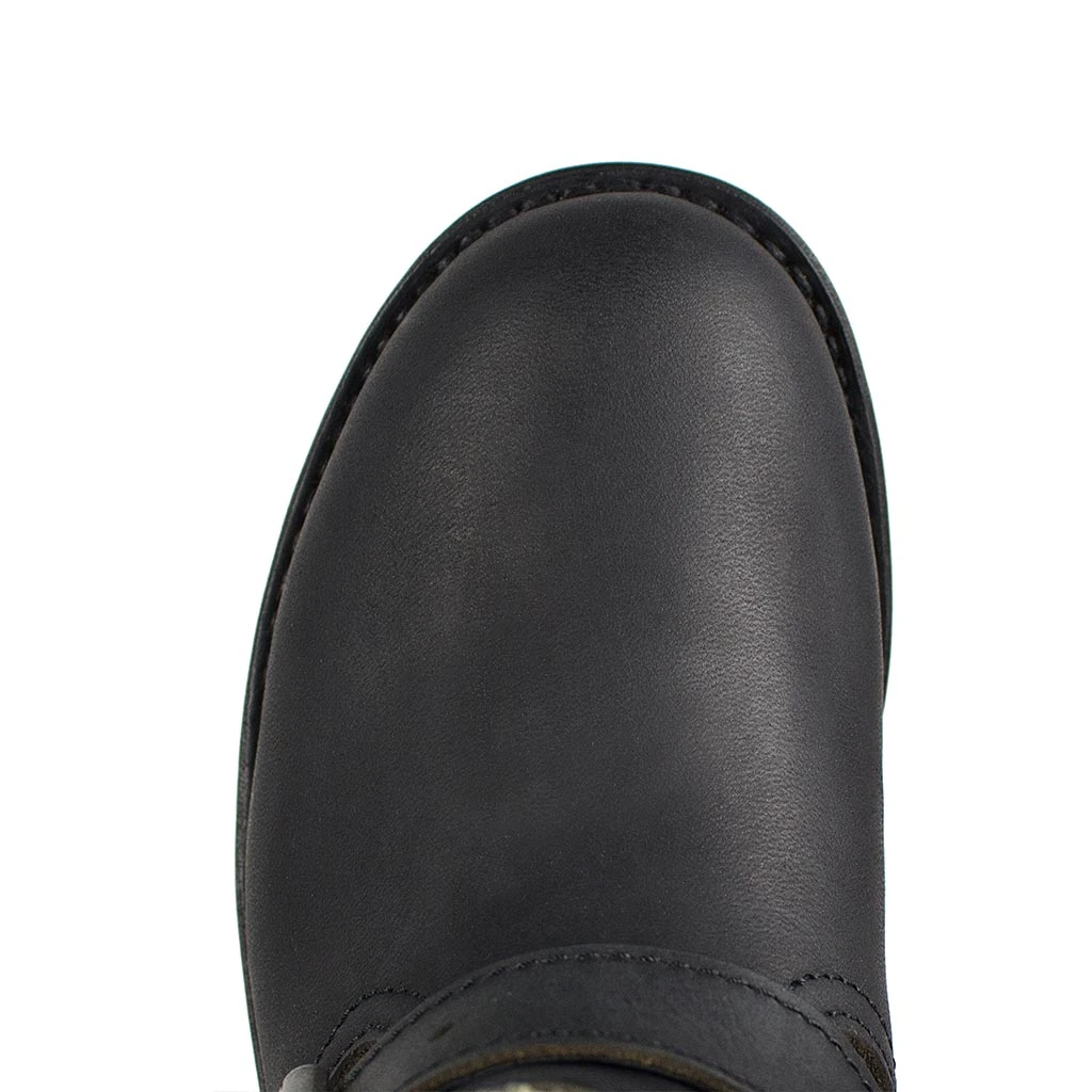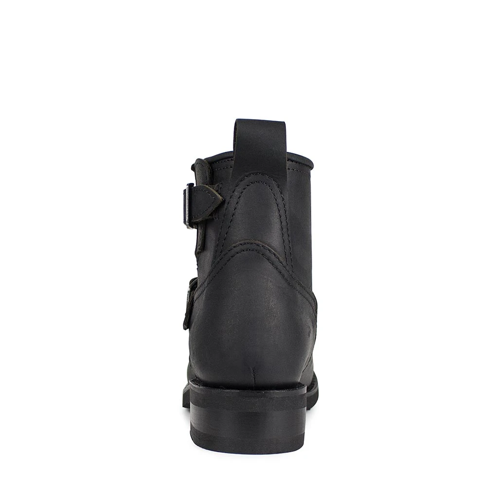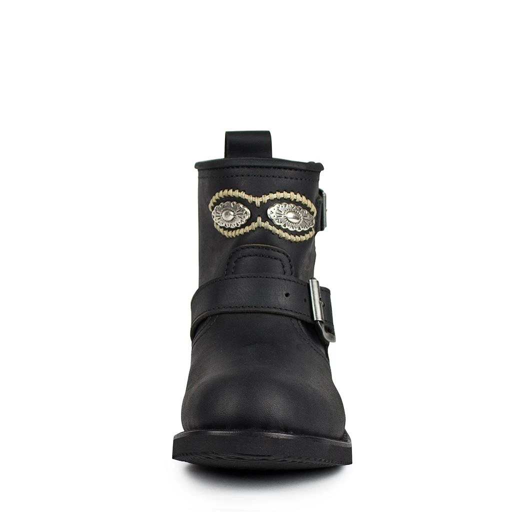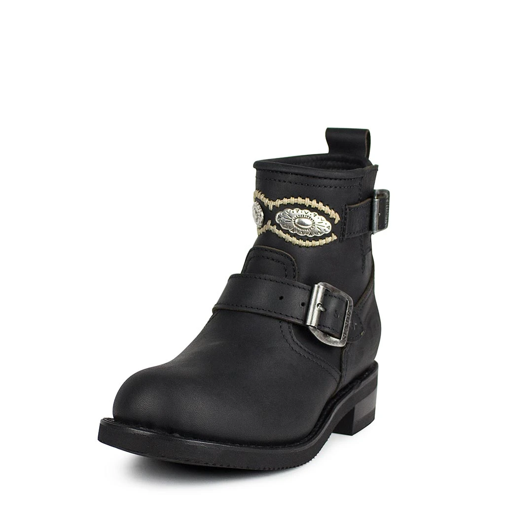 Botín de color negro con doble correa para un mejor acceso del pie y hebilla en la parte superior de la caña. Tacón de cuero y goma para una mayor comodidad a la hora de caminar.
