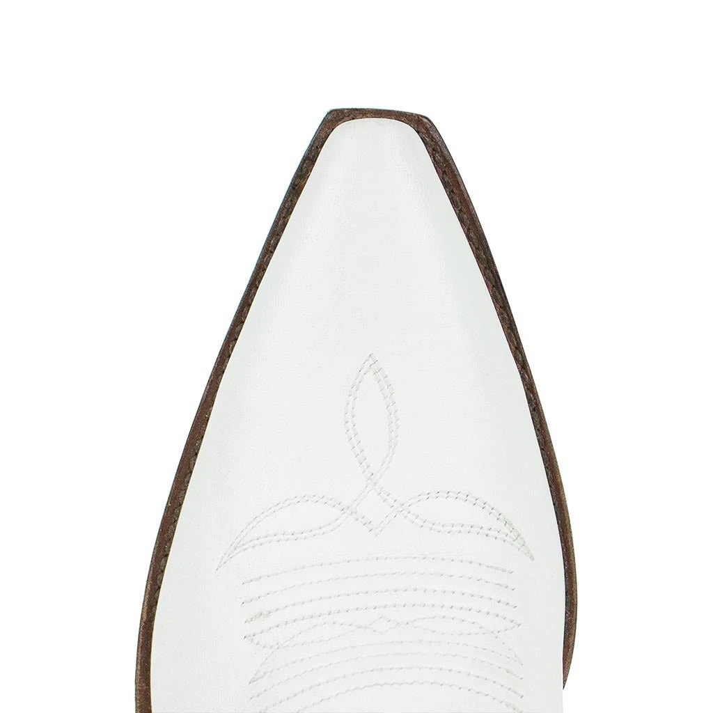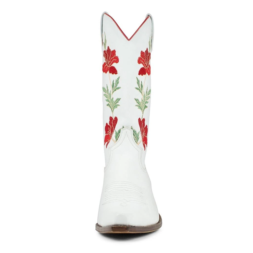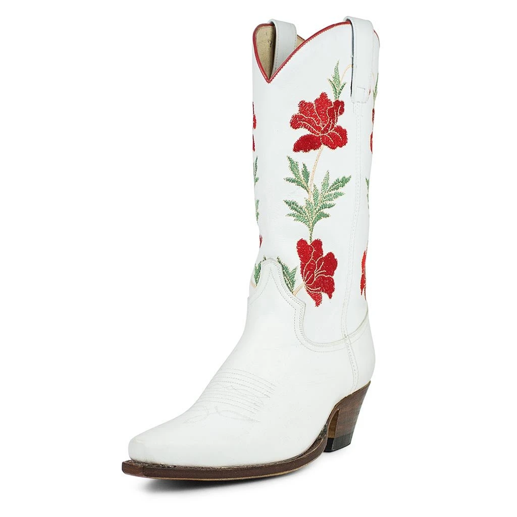 Estupenda bota con bordados de flores color rojo en la caña y unos pespuntes idóneos en el empeine. Un tacón de 4,5 centímetros semicubano para una mayor comodidad a la hora de caminar.