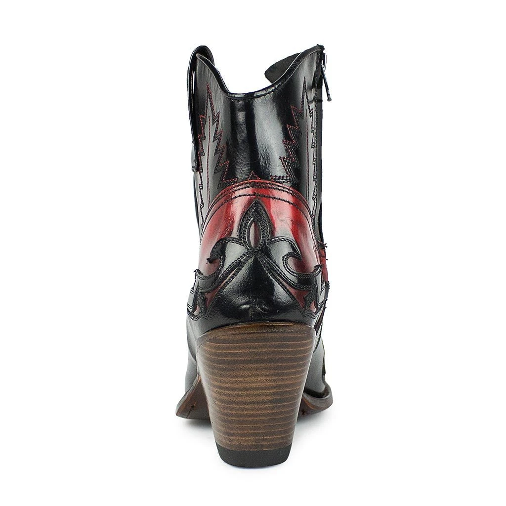 Botín de colores negro y rojo con bordados a lo largo de todo el botín. Tacón de 7,5 centímetros semicubano para realzar tu belleza.