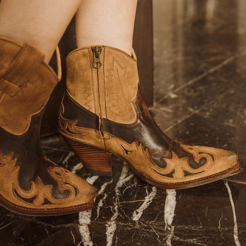 Botín de colores amarillo y marrón, con bordados a lo largo de todo el botín. Tacón de 7,5 centímetros semicubano para realzar tu belleza.