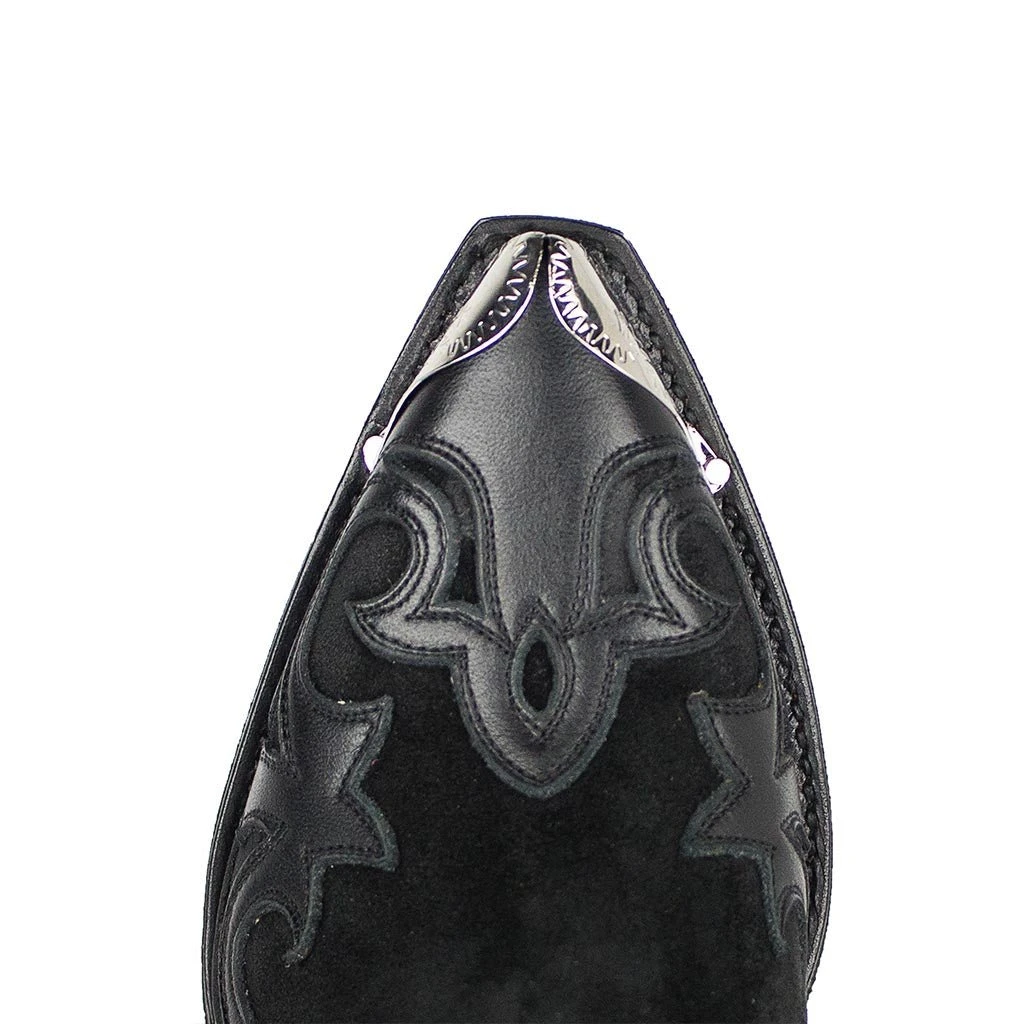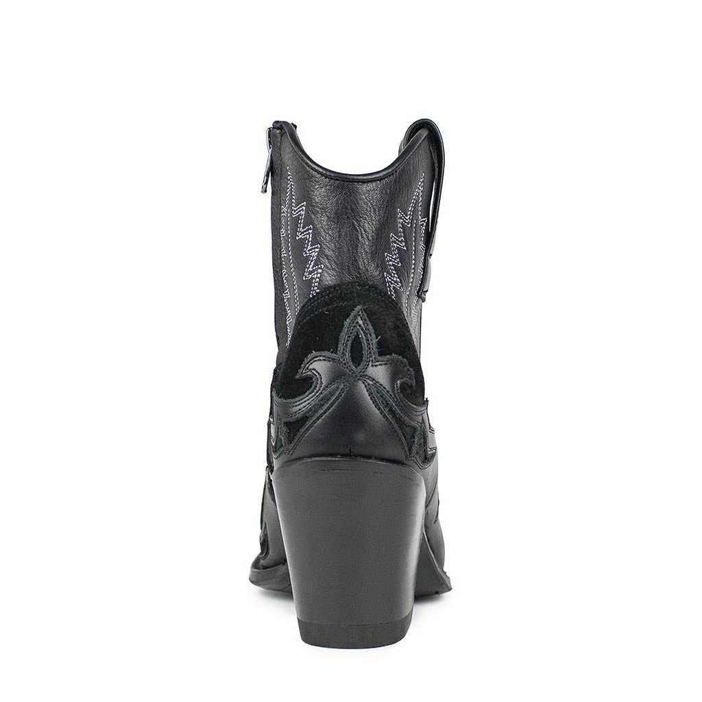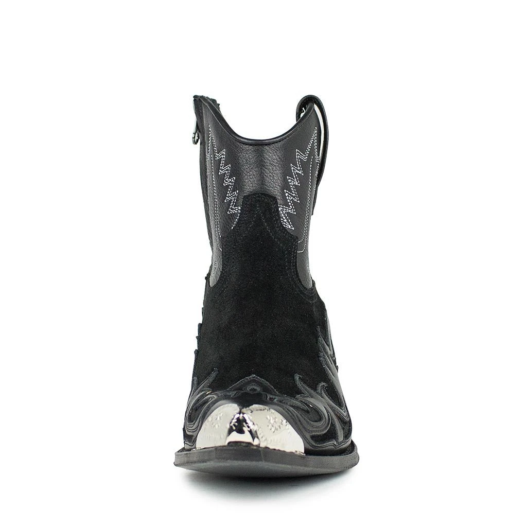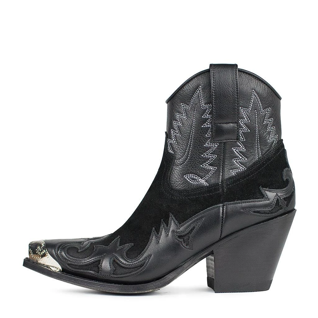 Botín de color negro con pespuntes a lo largo de todo el botín y puntera metalizada. Tacón de 7,5 centímetros semicubano para realzar tu belleza.