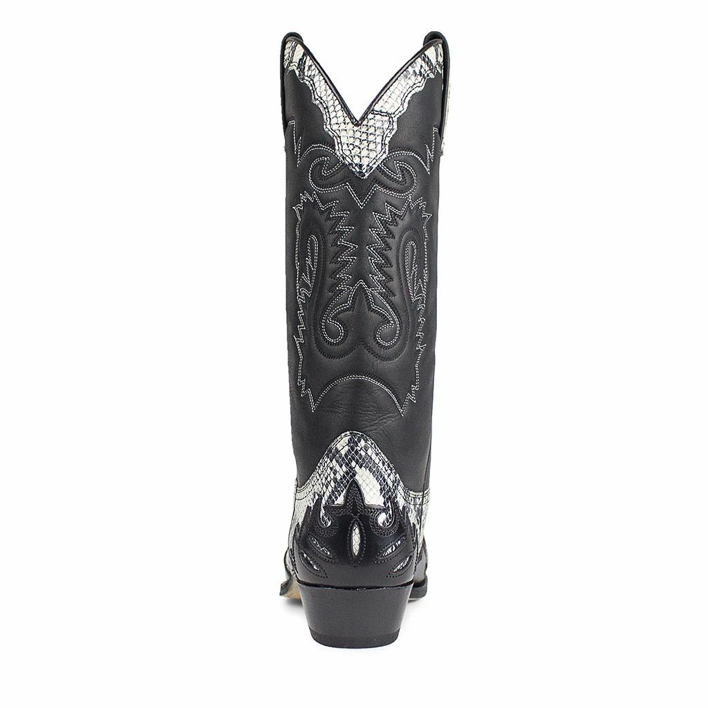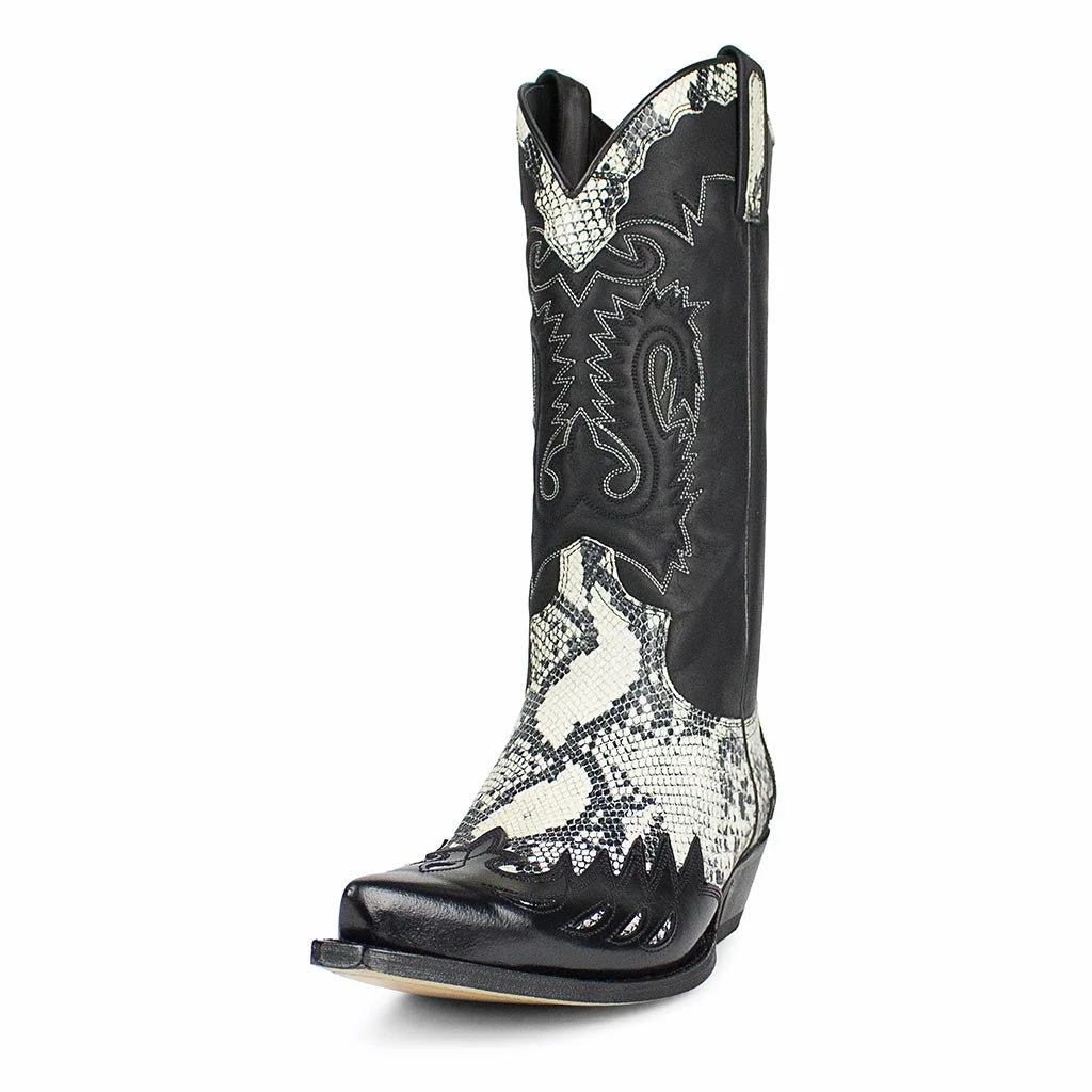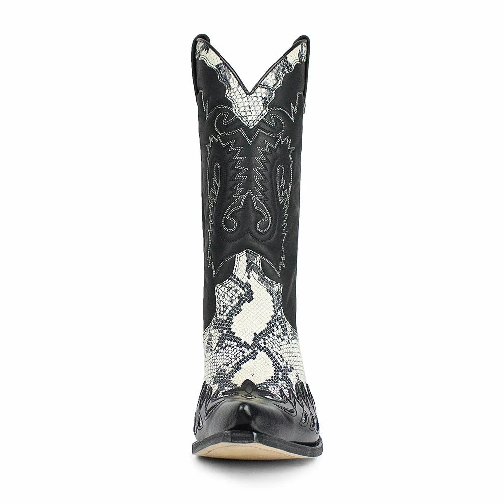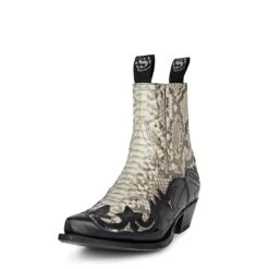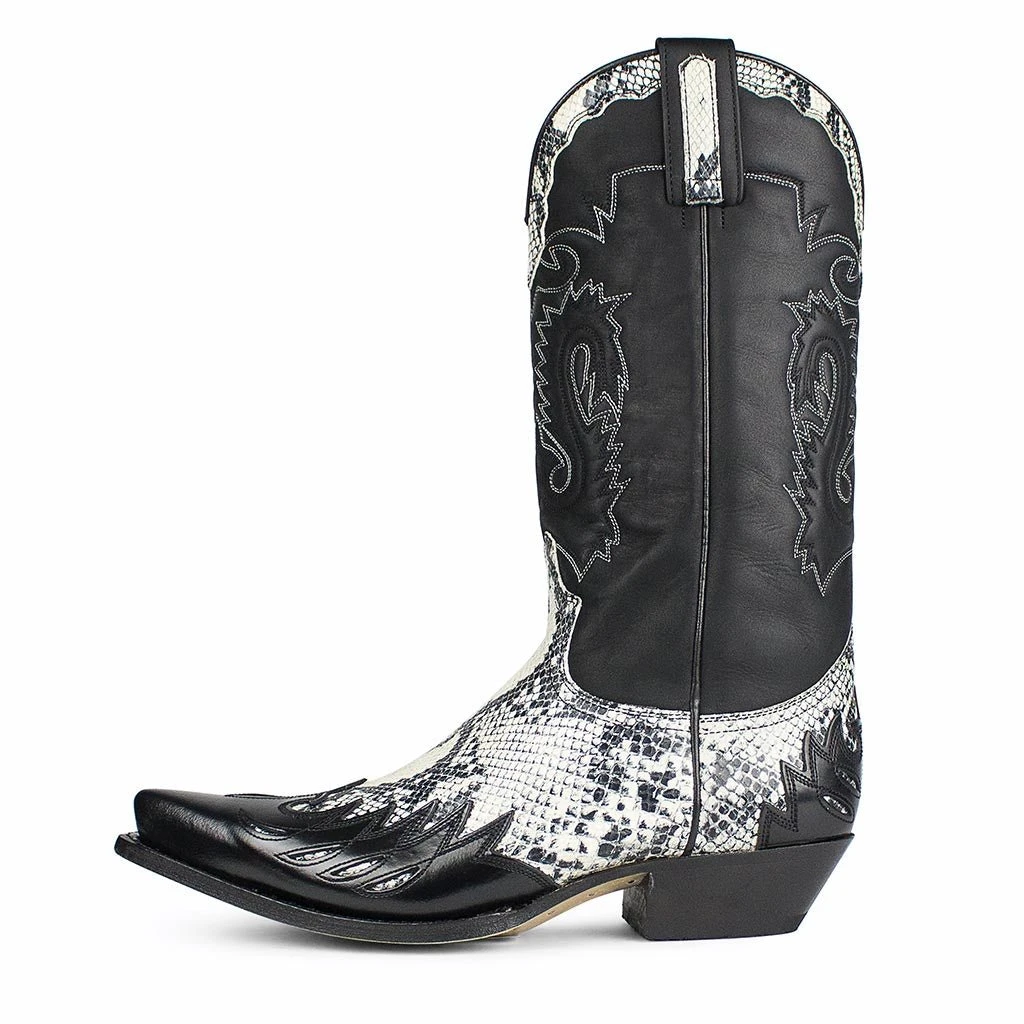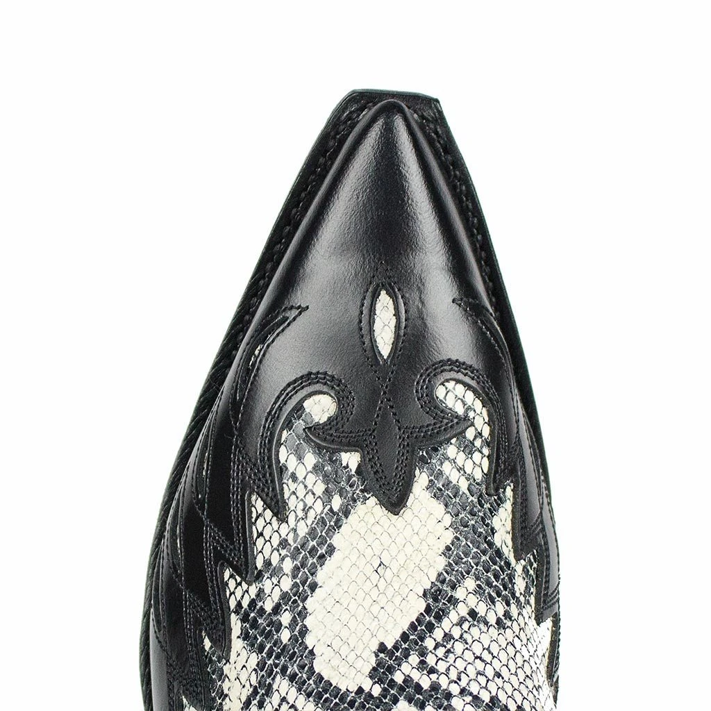 Bota Sendra nueva colección, un modelo referente, con imitación del Python en blanco y negro, y una piel negra en. el recosido y la caña, con 3 cm de tacón, horma de punta y tacón cubano, fabricación goodyear y garantía Sendra.