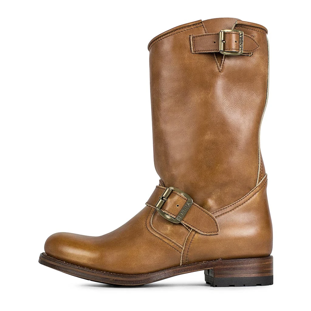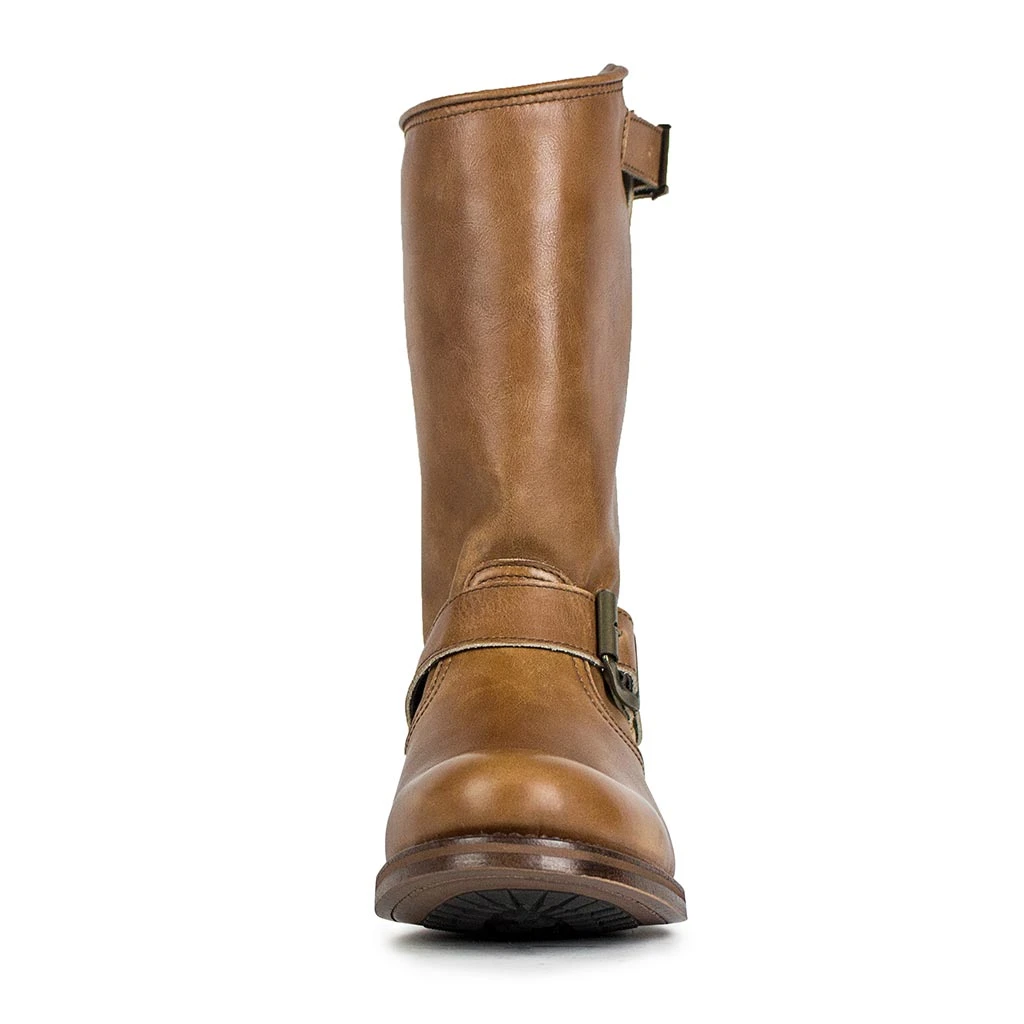 Bota de Sendra Biker, de piel marrón claro, de mujer, mezclando la imagen Biker con las pieles más actuales, poco tacón y horma redonda muy cómoda.
