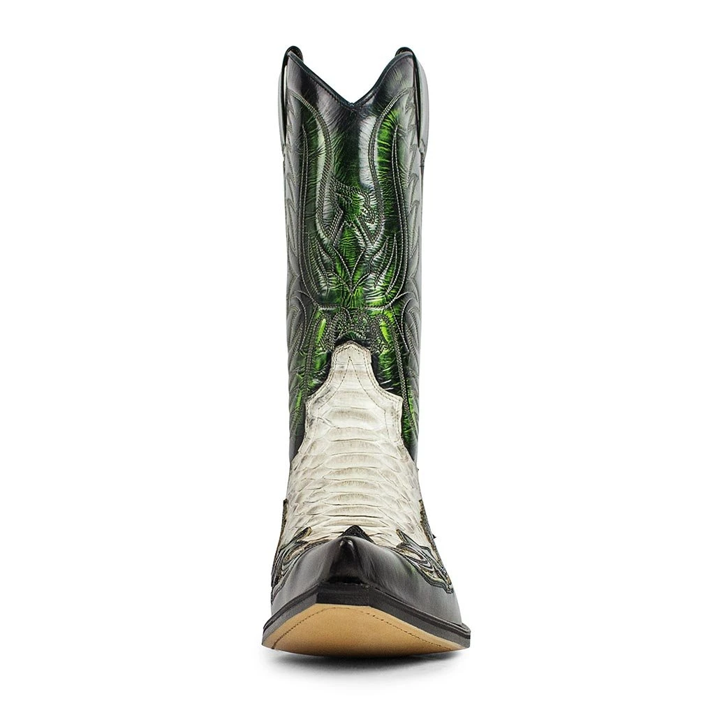 Bota Sendra combinada de piel de vacuno color verde con piel de pitón natural.