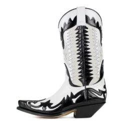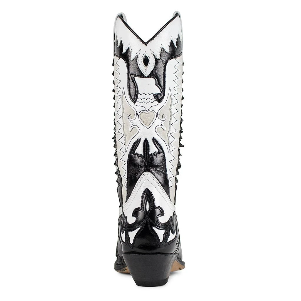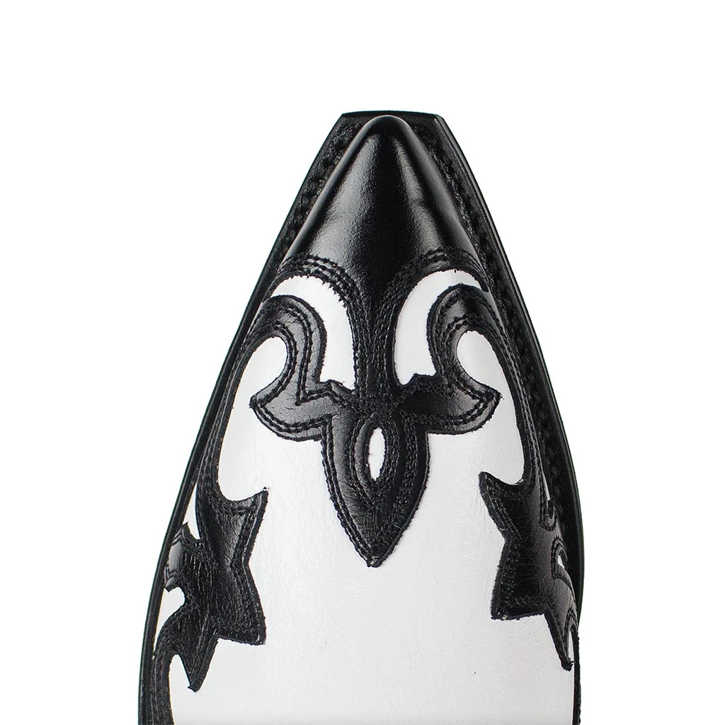 Fantástica bota de piel con mezcla de colores blanco y negro, bordados y calados de diseño en caña y pala. Cuenta con un tacón cubano y la clásica horma cuervo para darte un estilo único como solo Sendra sabe.