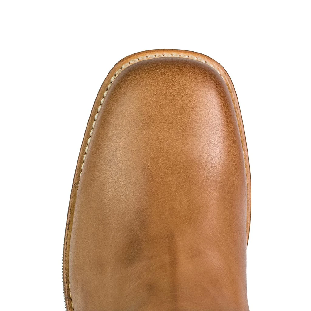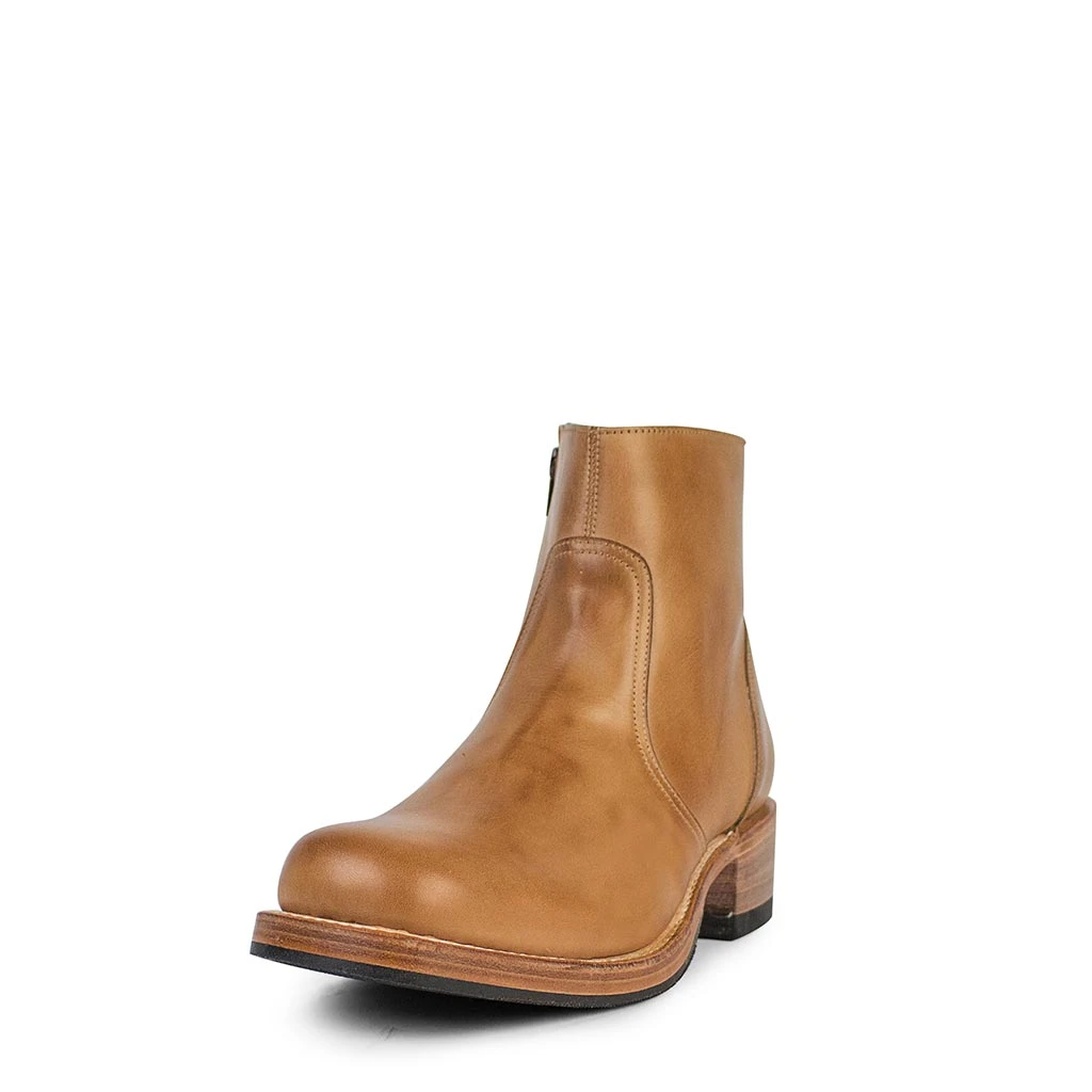 Botín con horma tipo biker de punta redonda y tacón cuadrado. Piel en tono camel y cremallera lateral. Suela de cuero con protección de goma.