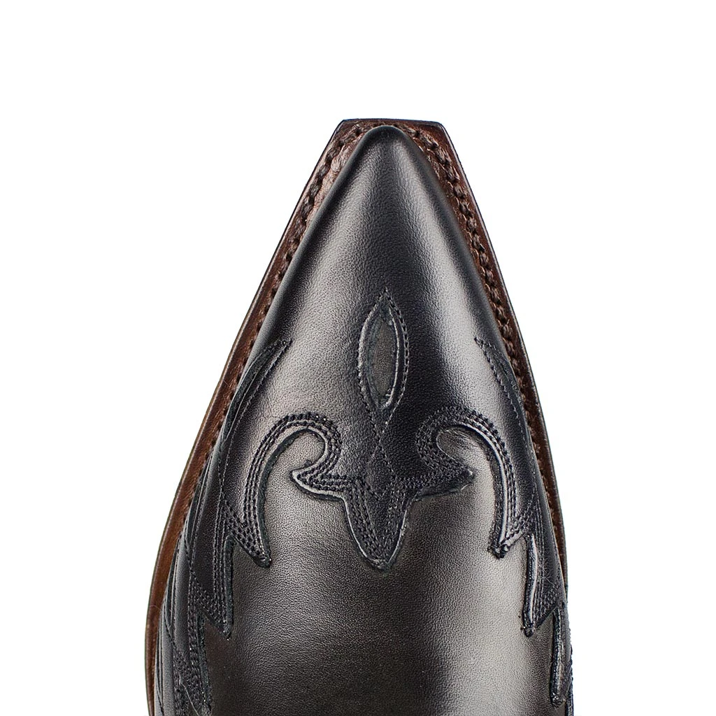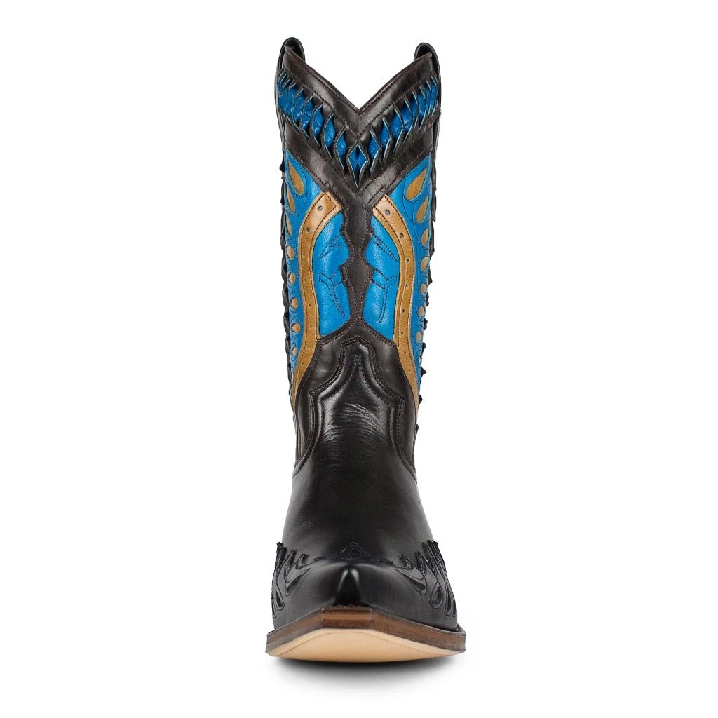 Bota de color negro con un bordado en la caña de color azul y dorado. Tacón de 4,5 centímetros cubano para una mayor comodidad a la hora de caminar sin perder elegancia.