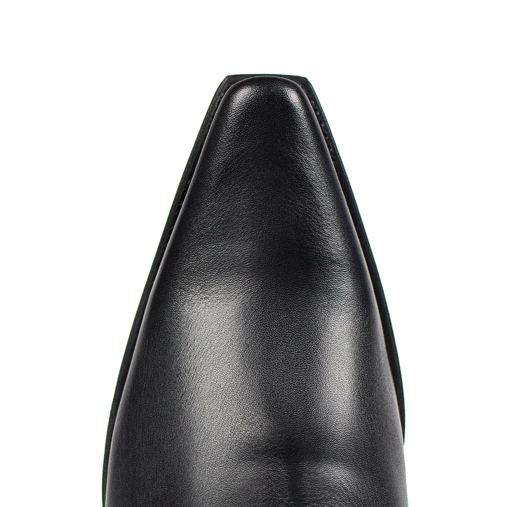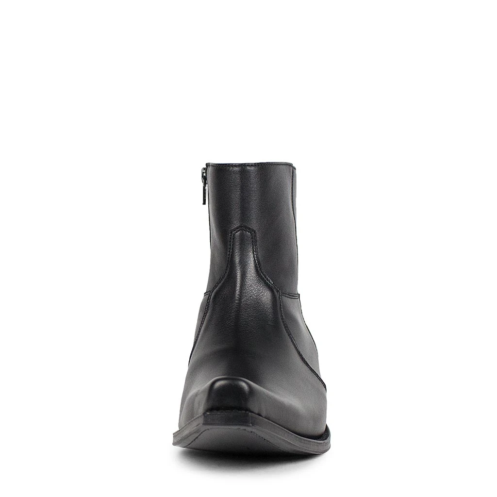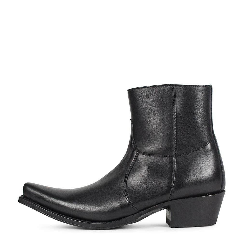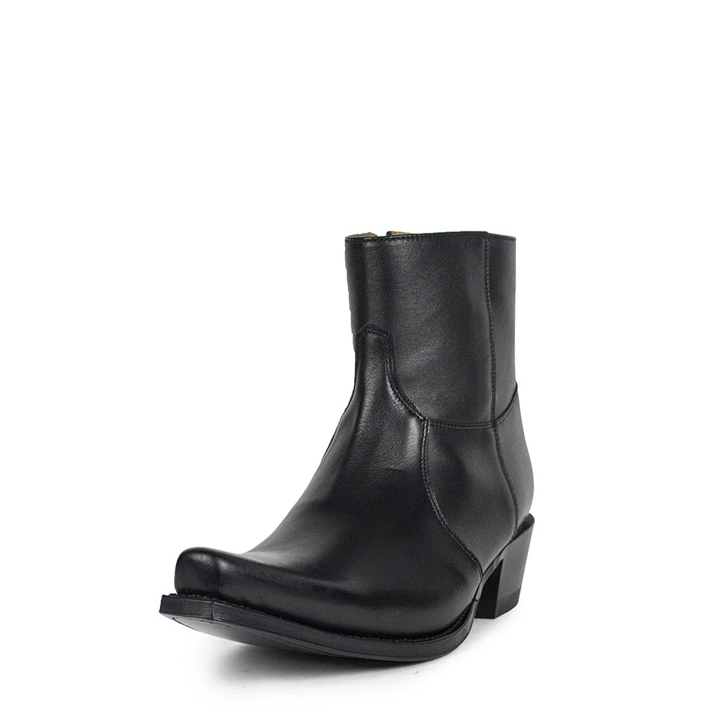 Elegante botín de Sendra en piel de vacuno color negro brillo. Un diseño de estilo campero y con cremallera lateral en la caña para facilitar su calce. Elaborado con una piel muy confortable con cosido Goodyear y suela de cuero.