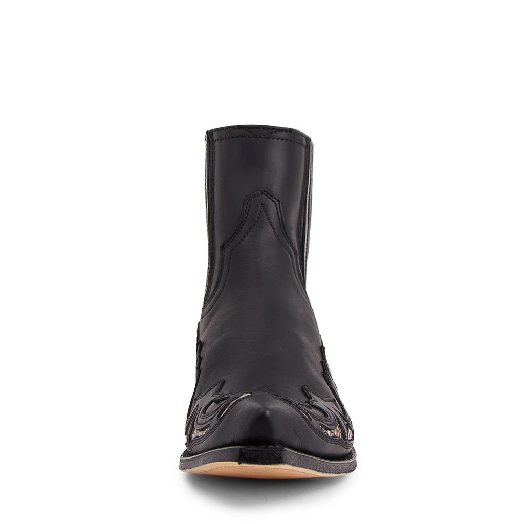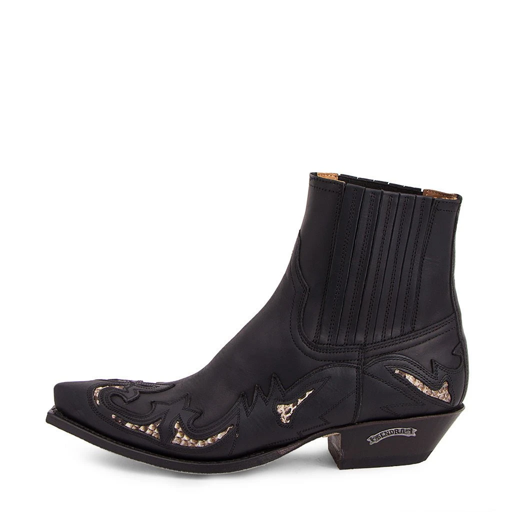 Botín de Sendra en piel negra engrasada, con transparentes en pyton natural, tacón cubano y elástico lateral para tu mayor comodidad,un modelo referente en nuestra colección cowboy, discreto pero con nuestro sello Sendra.