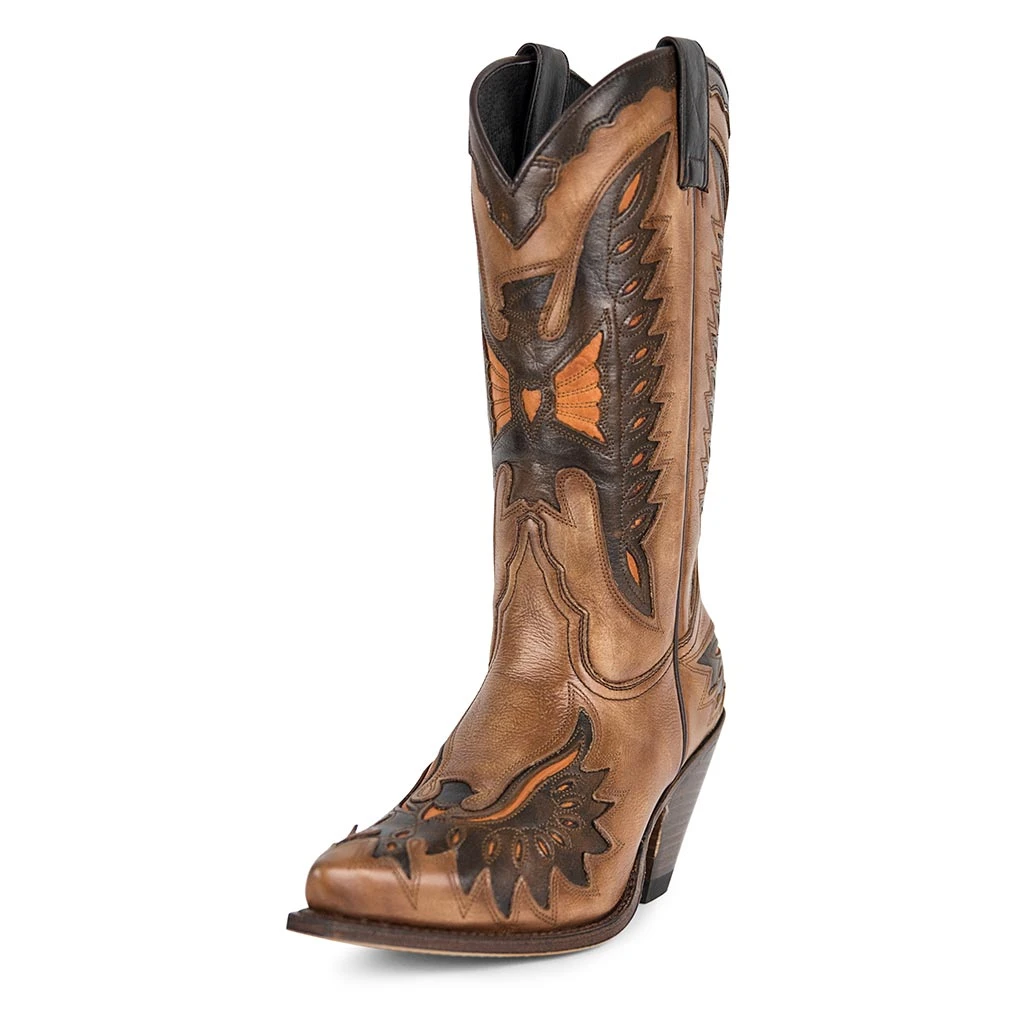Botas ideales para combinar tu estilo. Están fabricadas con material de cuero de alta calidad y el color marrón le da un toque moderno y elegante. El tacón semicubano de 7,5 centímetros realza tu belleza al caminar, y los bordados de alas le aportan un toque de originalidad y estilo único. Todo con la garantía de Sendra y fabricación Goodyear.