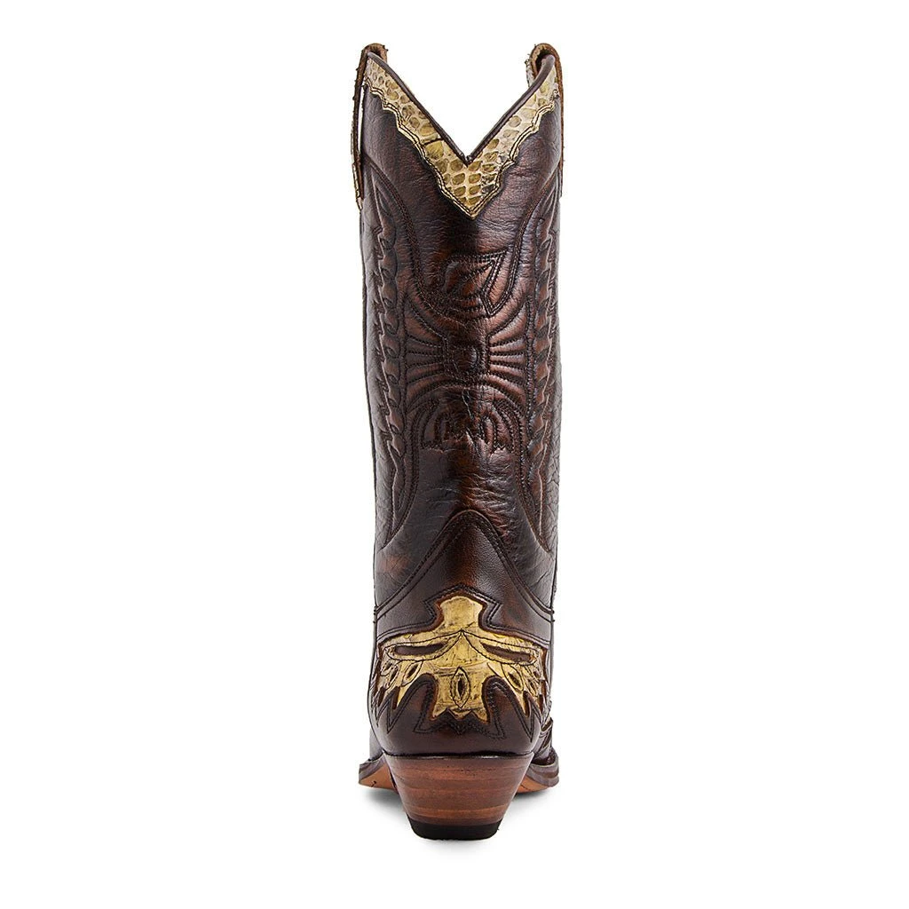 Bota de Sendra en piel marrón y pitón amarillento,en forma de águila,con punta cowboy y tacón cubano, un modelo cowboy con suela de cuero y fabricación goodyear