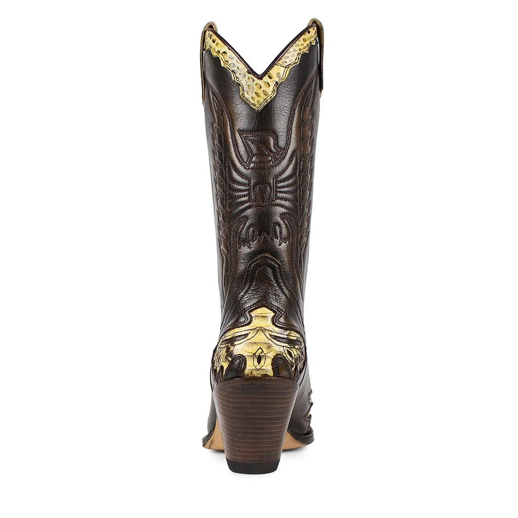 Bota de color marrón con la punta, talón y parte superior de la caña en piel escamada amarilla con toques negros. Tacón de 7,5 centímetros semicubano para realzar tu belleza.