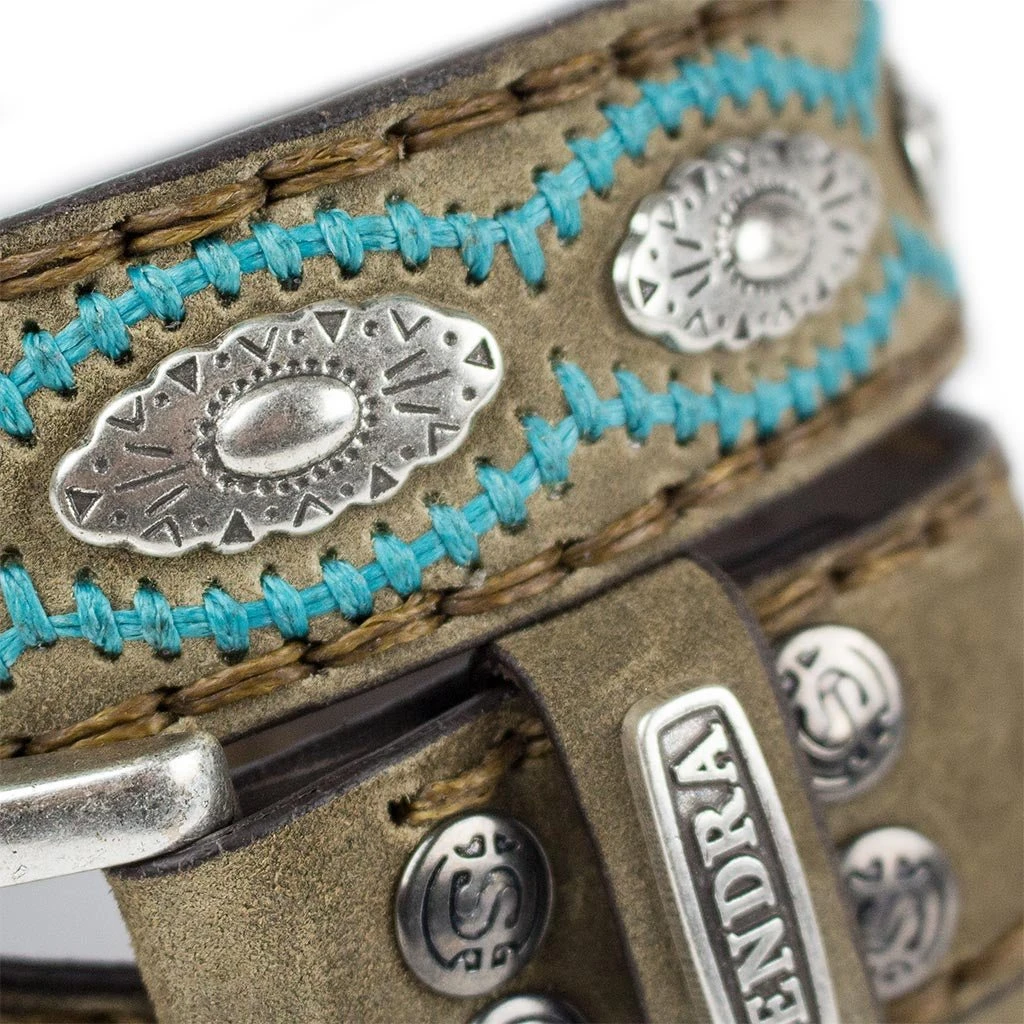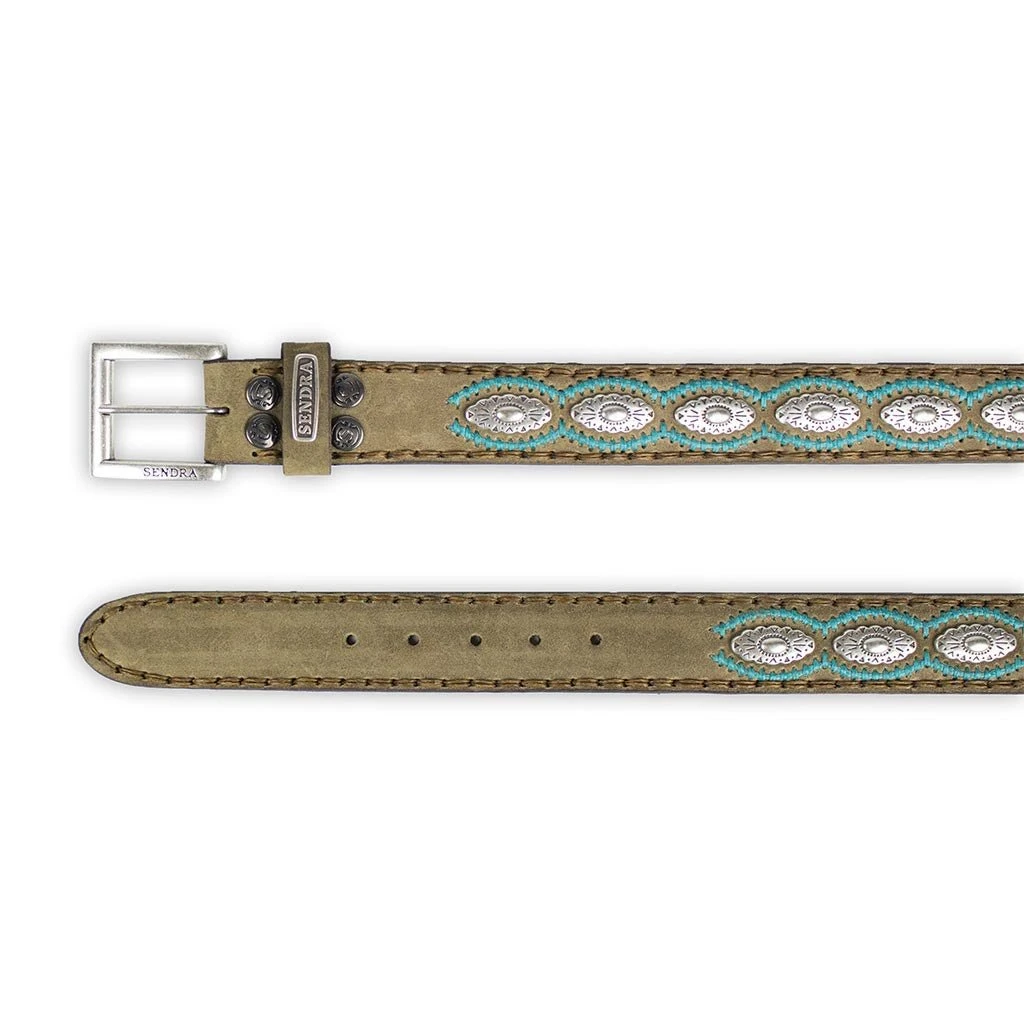 Maravilloso cinturón Sendra con el logotipo de Sendra en la hebilla de color plata, un conjunto de mini remaches en la parte de la hebilla y remaches a lo largo de todo el cinturón rodeados de pespuntes turquesas.