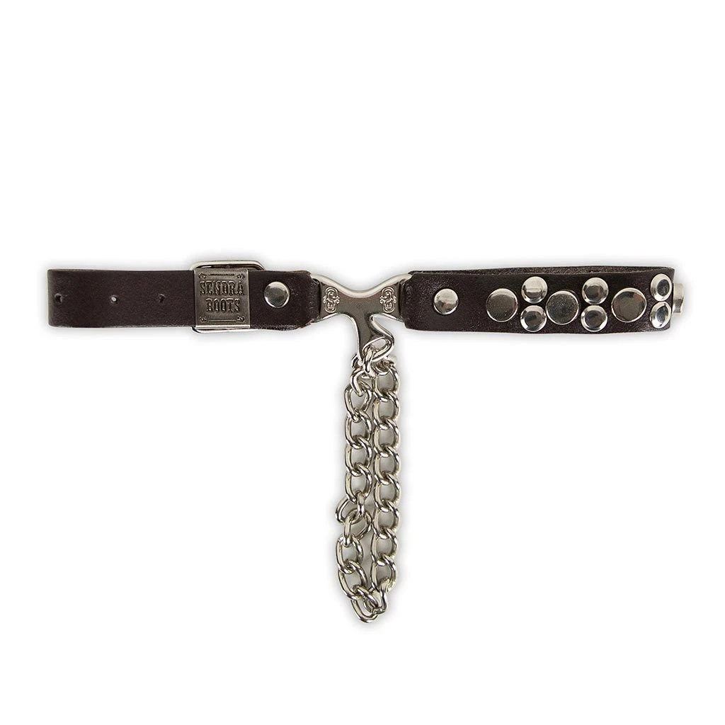 Arnés de color marrón oscuro con una colección de remaches circulares plateados.