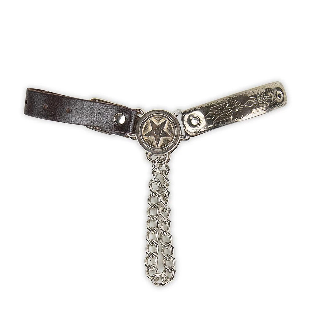 Arnés de piel negra con un remache central en forma de estrella y un remache dorado en la izquierda.