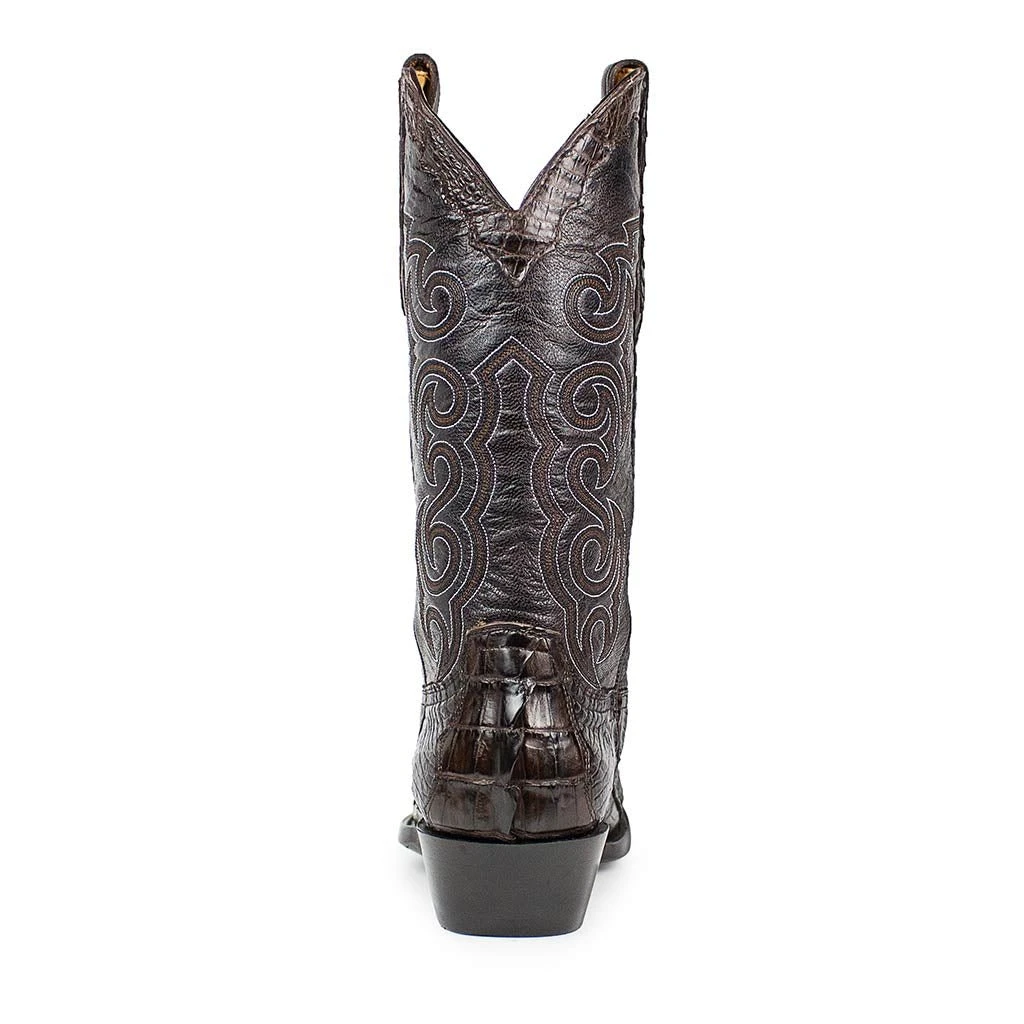 Bota de piel escamada marrón con bordados en la caña. Tacón de 4,5 centímetros semicubano para una mayor comodidad a la hora de caminar sin perder elegancia.